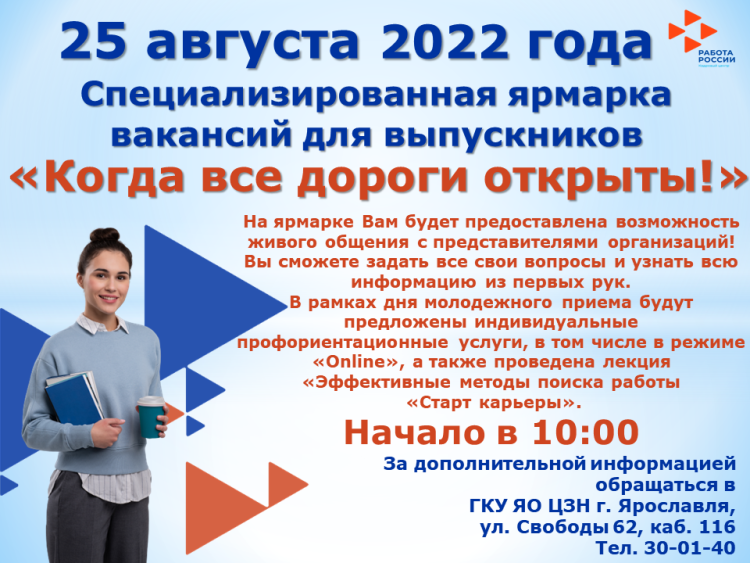 Центр занятости населения города Ярославля приглашает выпускников на специализированную ярмарку вакансий «Когда все дороги открыты!» 25.08.2022г.